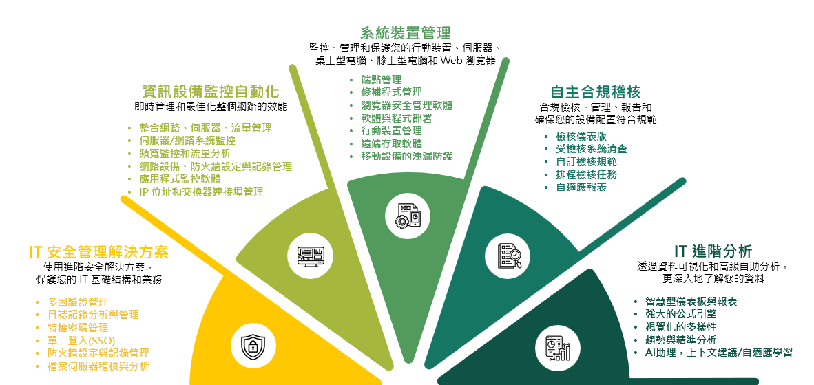 SYSGUARD 具備 IT 安全管理解決方案、系統裝置管理、IT 進階分析、網路和伺服器管理以及自主合規稽核等多種模組,能協助企業提高稽核管理效率及準確性的解決方案,提供強大的設備日誌稽核與合規檢核功能,讓企業能輕鬆掌握資訊系統運作狀態。